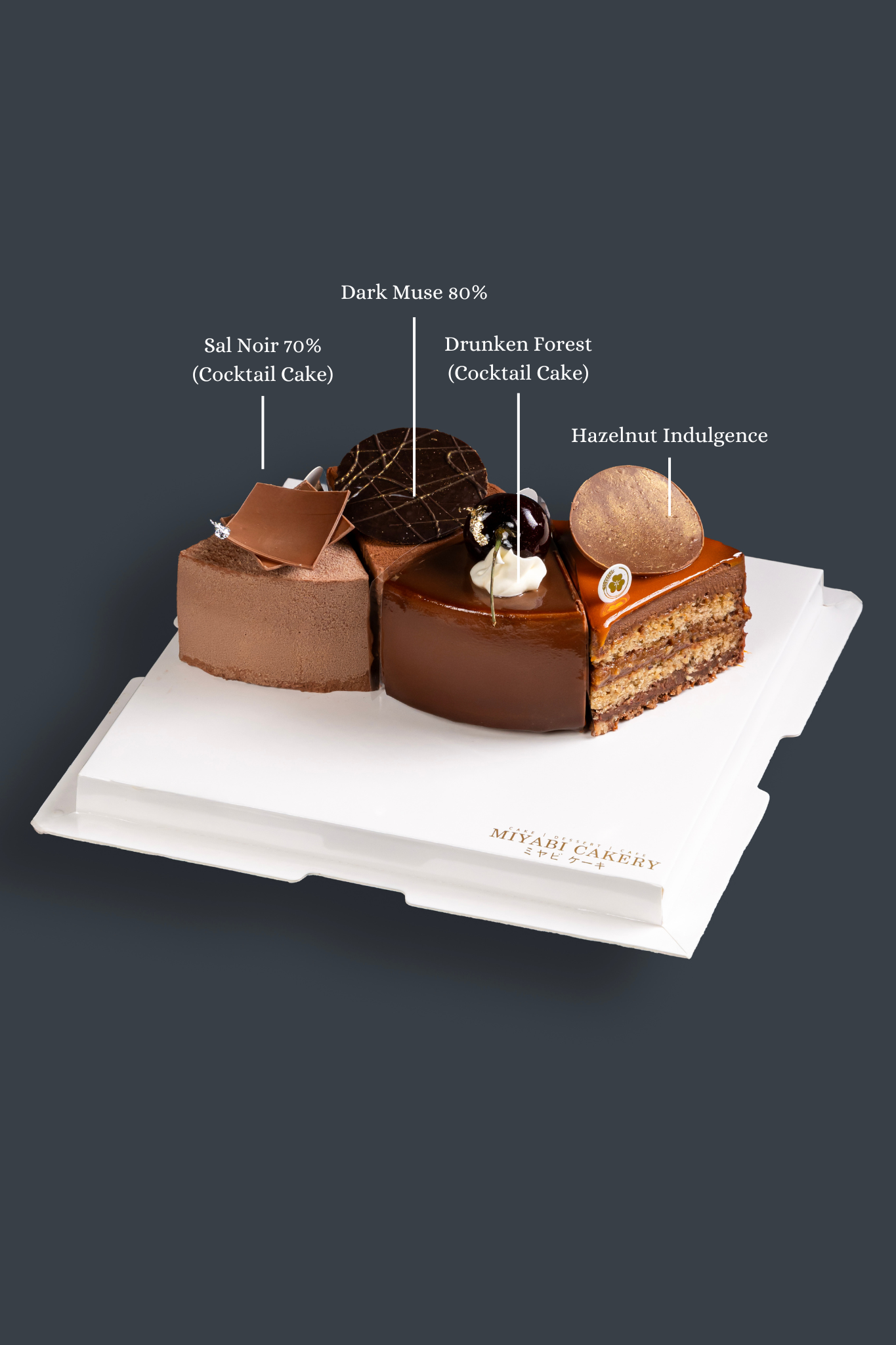 A curated quartet for the discerning chocophile. From bittersweet dark to mellow milk and nutty notes, each slice offers a distinct facet of artisanal chocolate indulgence.