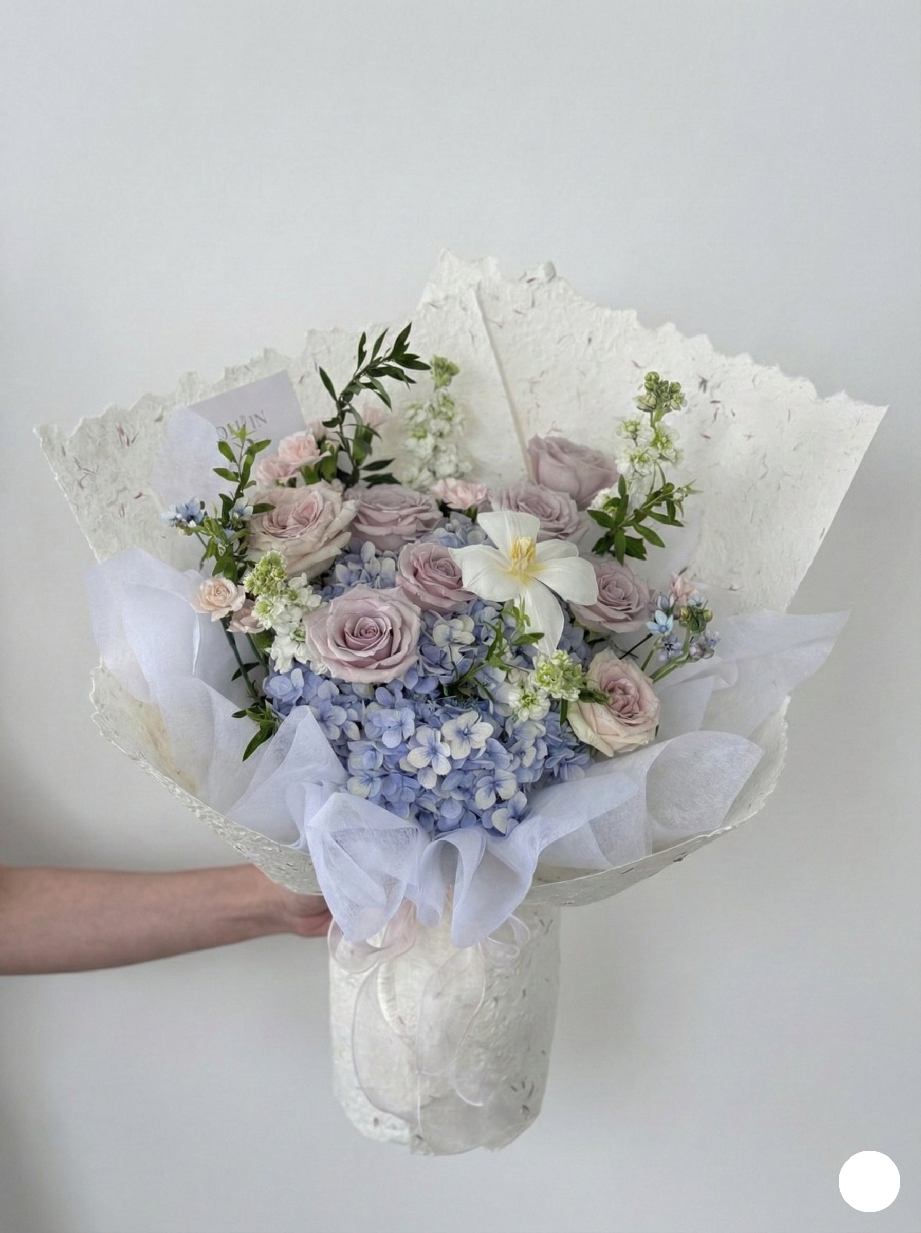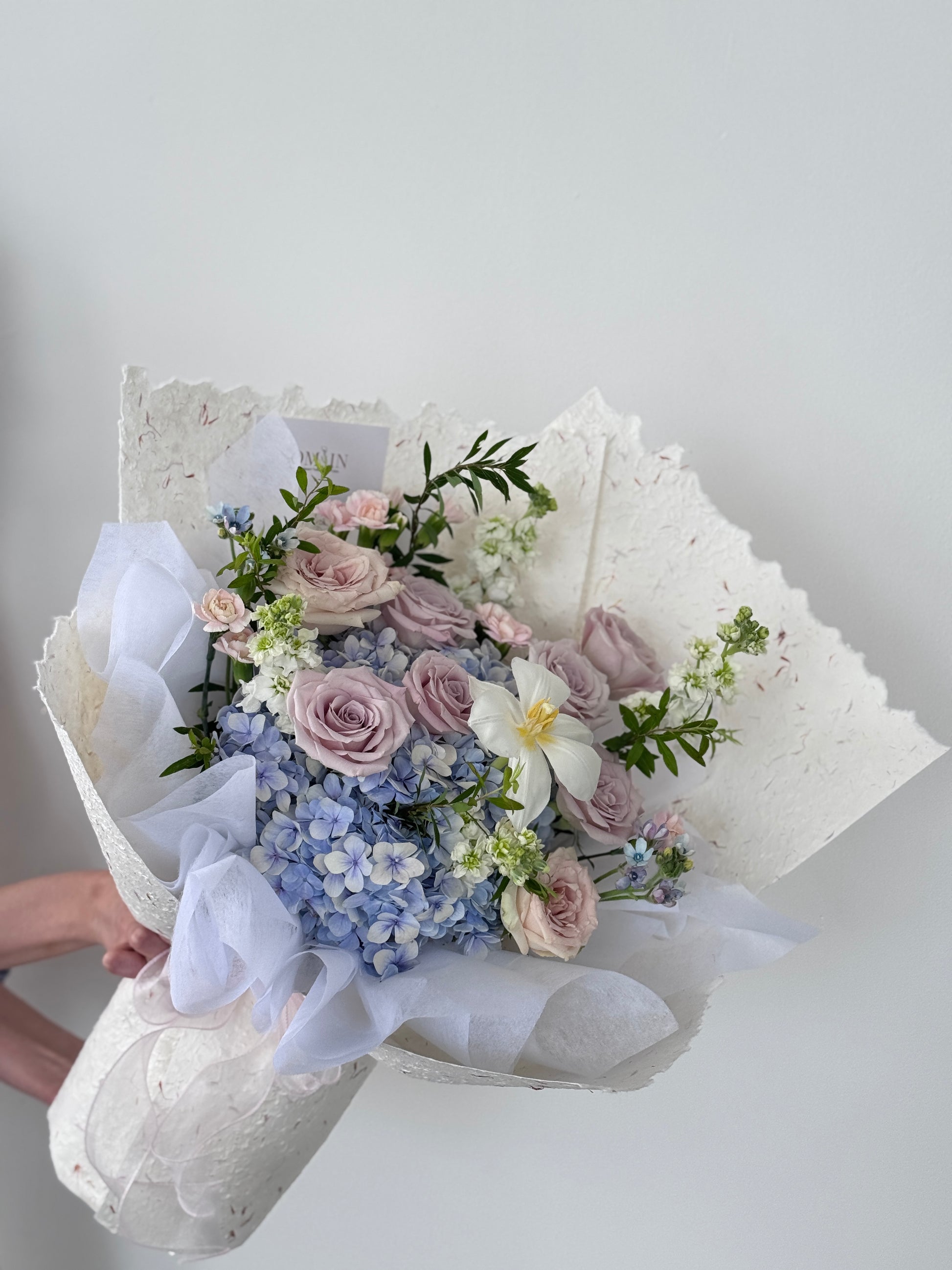Sake Light captures the essence of Japanese elegance through a carefully curated floral composition. This arrangement features blue hydrangea and oxypetalum for serene depth, complemented by manta and quicksand roses that introduce soft, romantic tones. White matthiola and tulips provide crisp contrast and delicate fragrance, while spray carnations add textural interest and longevity. Finished with snowflake leaf for architectural sophistication, this bouquet balances contemporary design with timeless refinement—ideal for those seeking understated luxury in their floral presentation.