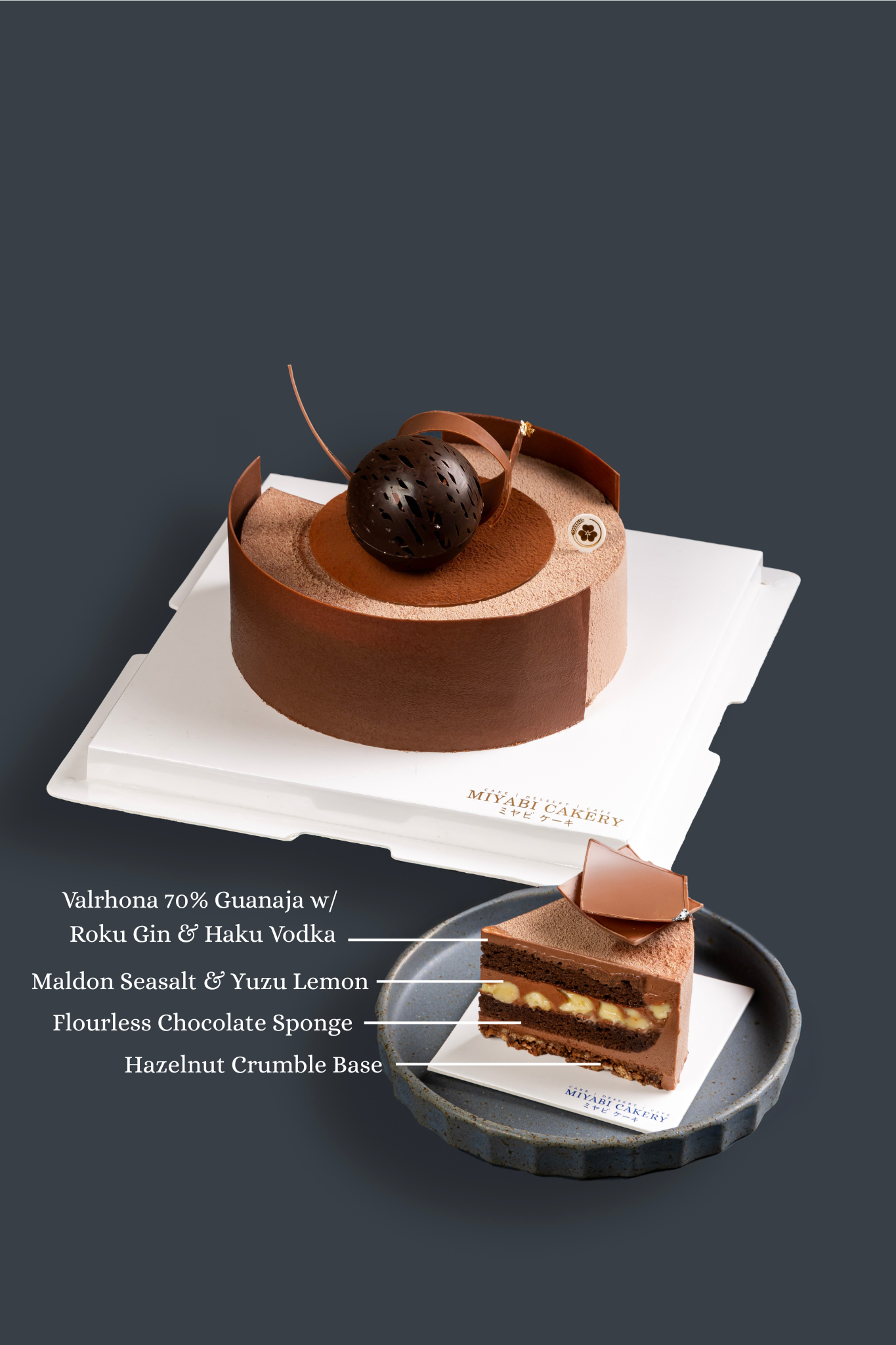 ‘Sal Noir’ is a sophisticated, adult dessert featuring Valrhona 70% Guanaja chocolate mousse, Roku Gin, Haku Vodka, and a bright yuzu ganache center. This cake is dark, intense, and stunningly refreshing with a sea salt finish that leaves a lasting impression. The initial chocolate bitterness gives way to citrus brightness and boozy complexity. Sea salt on the hazelnut crumble base enhances every note, creating a clean, umami-rich finish. One of our most daring cakes—unexpected, refined, and deeply modern.